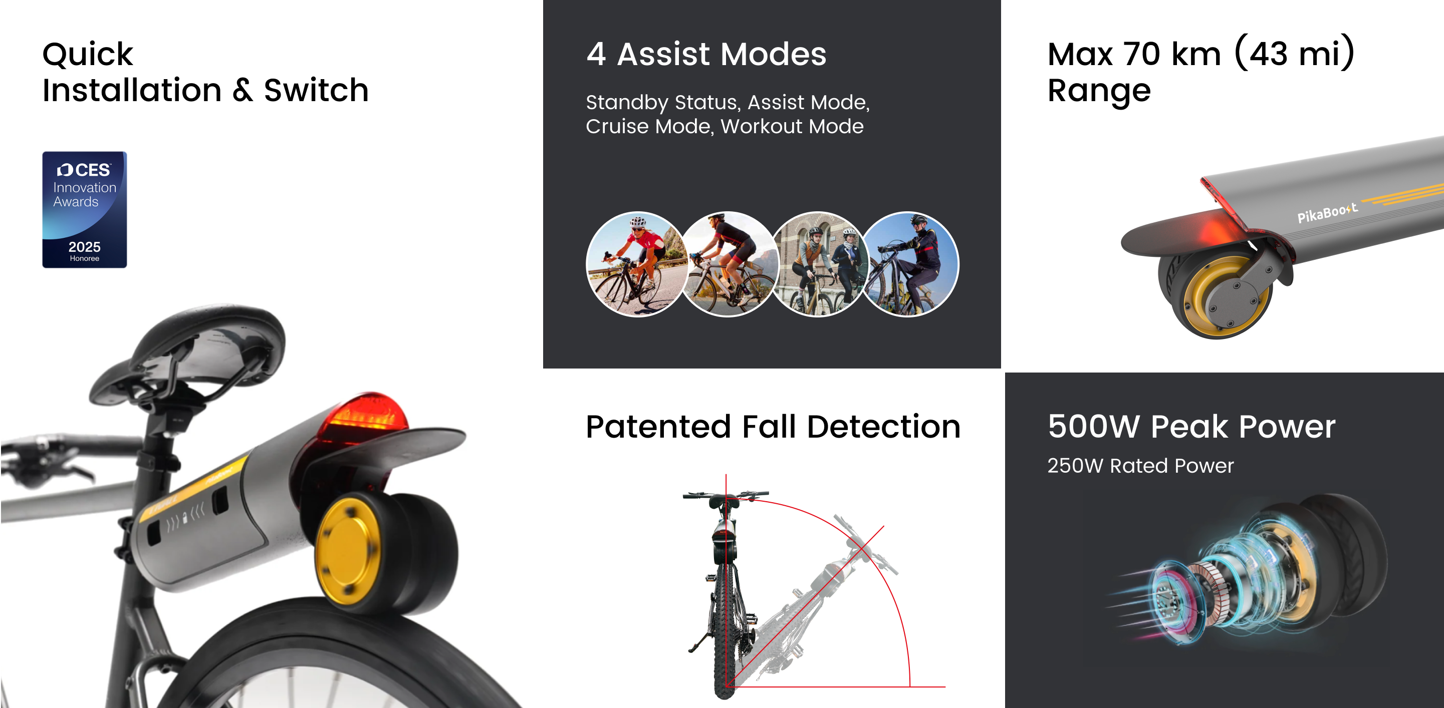 Quick Setup, Easy Switch: Easily electrify your bike with PikaBoost 2’s slipk, compact design. It ensures a quick and secure installation on your bike without extra wires. Plus, its portable size lets you easily switch between bikes—one unit is all you need for you and your family’s bikes.
