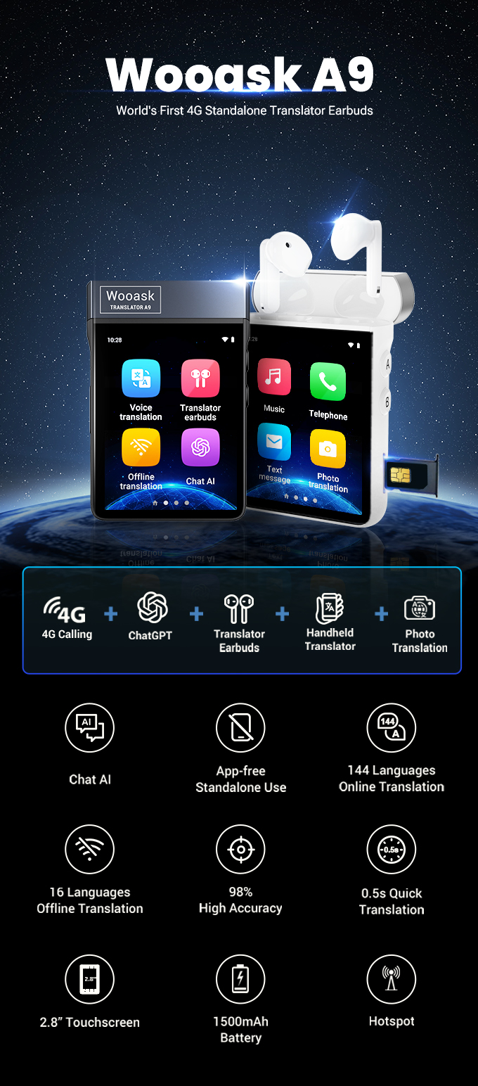 WOOASK A9, a product that perfectly combines the functions of mobile phone, CHATGPT and translator ,translator earbuds, can be used independently without relying on the mobile phone. It can not only translate and listen to music, but also insert SIM card to make calls and share WIFI hotspot. Combined with CHATGPT, you can always use voice to ask all kinds of questions about attraction introduction, travel planning, recommended restaurants, hotels and other various issues, you will always have a virtual intelligent assistant.