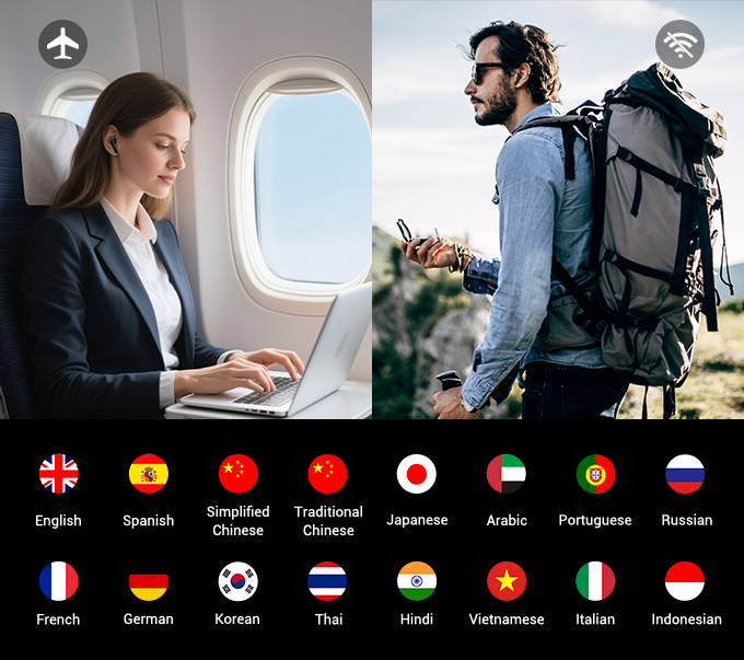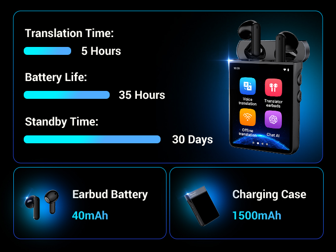 With a 40mAh battery in each earbud and a 1500mAh charging case, the A9 offers up to 5 hours of continuous translation. When combined with the charging case, you get an impressive 36 hours of total use. Plus, the A9 boasts a standby time of up to 30 days, ensuring you're always ready when you need it.